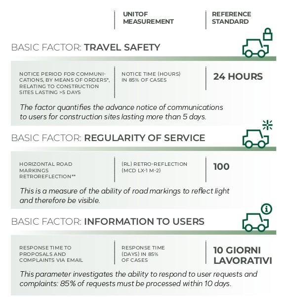 The quality indicators listed are experimental and comply with the provisions of the Directive of the Italian Ministry of Infrastructure and Transport no. 102 of 19 February 2009.