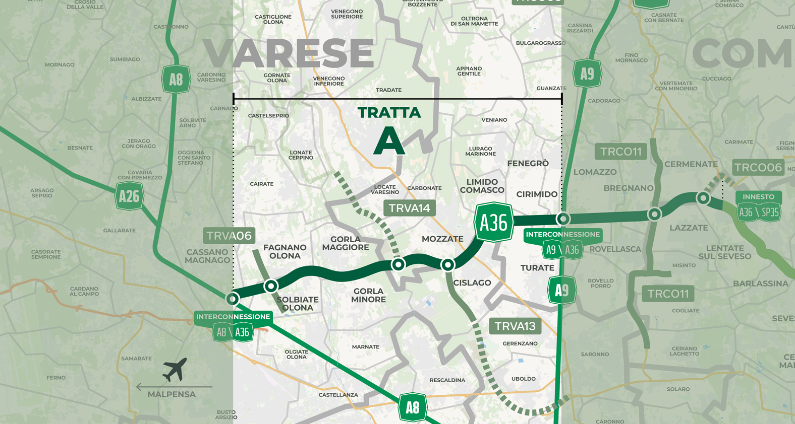 La tratta A comprende due opere di viabilità connessa: la TRVA 13+14, che collega i comuni da Mozzate a Tradate e da Cislago a Uboldo, e la variante alla TRVA06, che si sviluppa dal comune di Solbiate Olona a quello di Fagnano Olona.