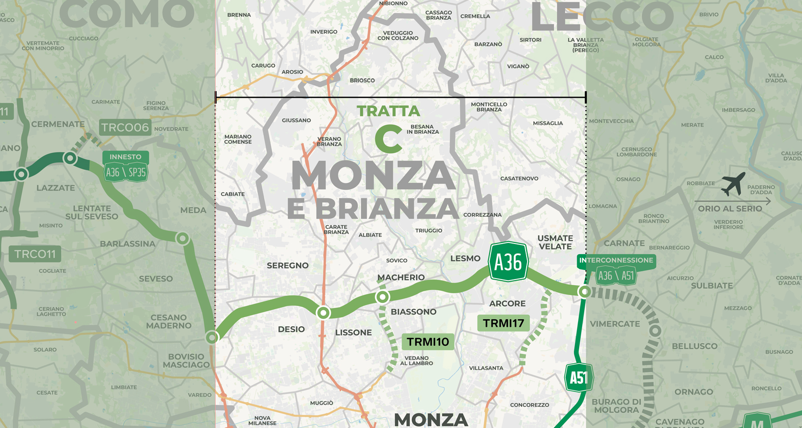 Il tracciato principale della tratta C va dall’interconnessione con la SP ex SS 35 Milano - Meda nel comune di Cesano Maderno fino all’interconnessione con la tangenziale Est/A51 nel comune di Usmate Velate. In una zona ricca di insediamenti, aree di pregio naturalistico e numerose aree agricole, lo sviluppo della tratta ha richiesto attenzione particolare per affrontare e risolvere le problematiche urbanistiche e ambientali.