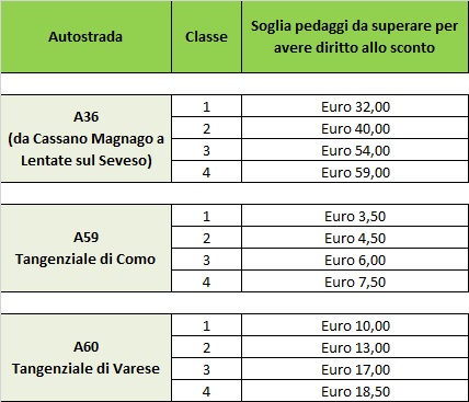 *Lo sconto del 50% sarà applicato sui pedaggi oltre la soglia indicata in tabella; all’inizio di ogni mese la soglia mensile dei pedaggi necessari per la scontistica verrà azzerato. Gli sconti sono applicati sulla singola targa e non sono cumulabili su più targhe.